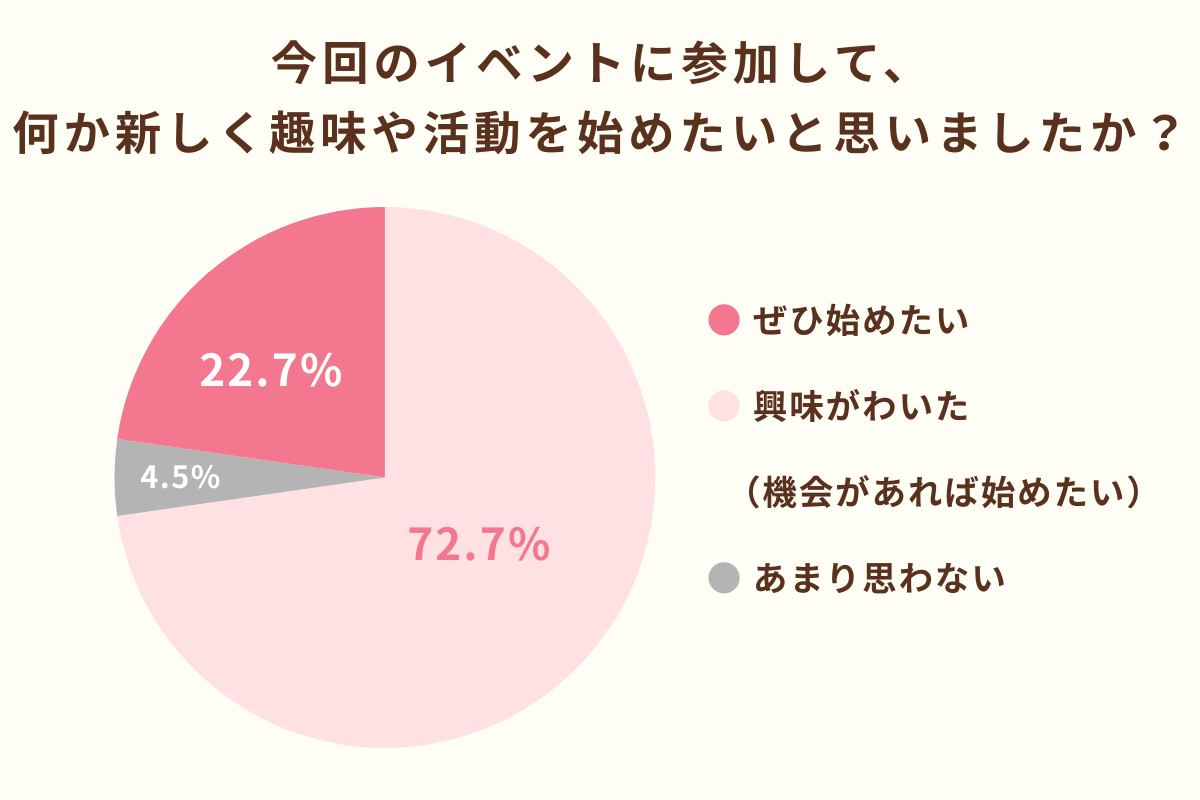 ※「今回のイベントに参加して、何か新しく趣味や活動を始めたいと思いましたか?」アンケート回答:「ぜひ始めたい」22.7%、「興味がわいた(機会があれば始めたい)」72.7%より
