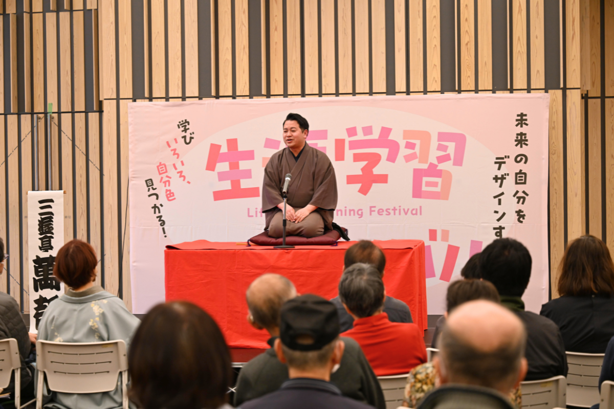 ステージには、落語家・三遊亭萬都(さんゆうていまんと)氏も登場。かつて千早地域文化創造館(※改装工事のため現在休館中)の社会人落語サークルに所属していた萬都氏は、まさに地域が生んだスターです。「地域での学びが人生を変え、プロの道へと繋がった」という実体験は、来場者に「生涯学習の無限の可能性」を強く印象付けました。