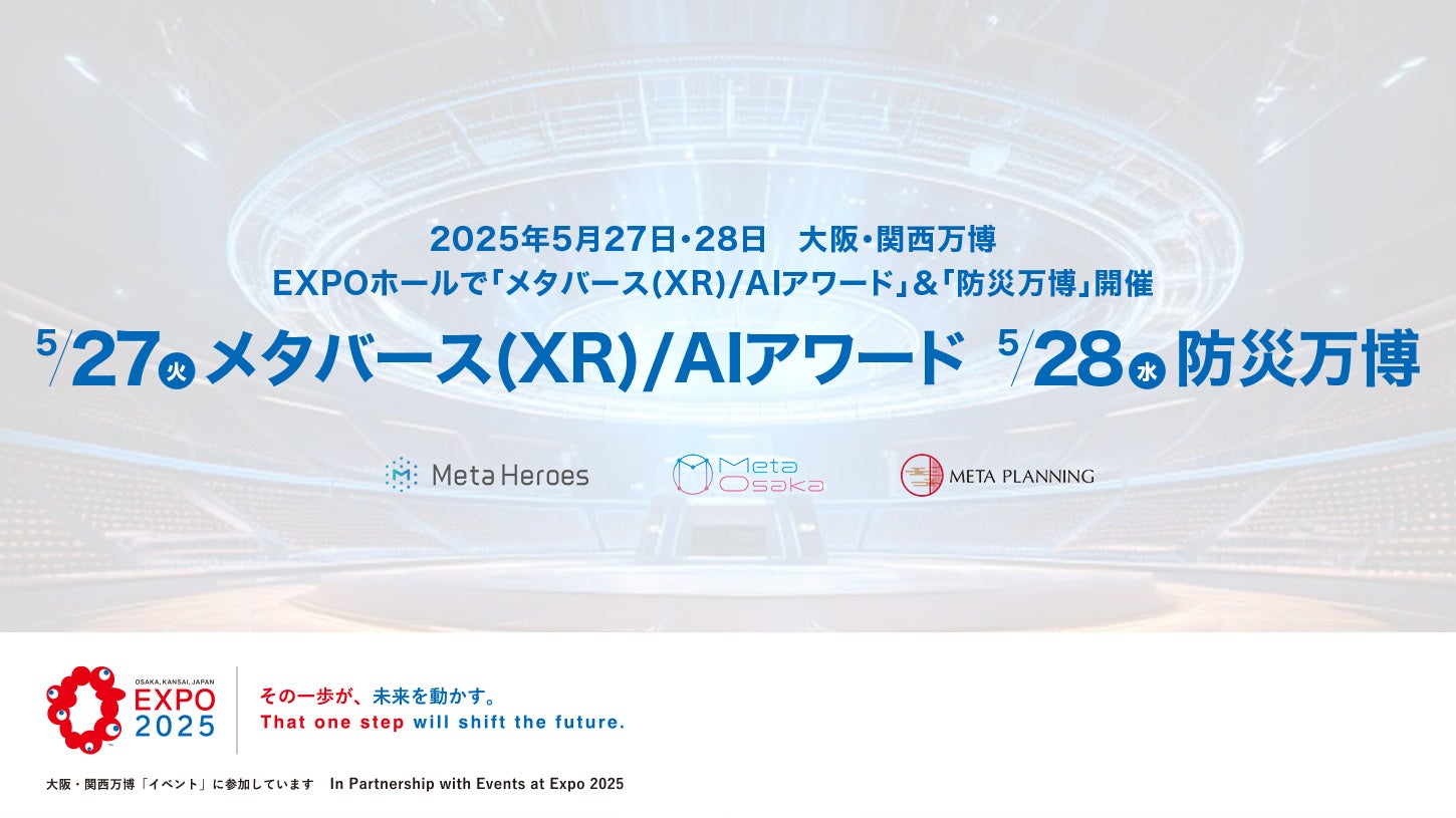 株式会社Meta Heroes(住所:大阪府大阪市 、代表取締役:松石和俊、以下「当社」)は、2025年5月27日(火)および28日(水)の2日間にわたり、大阪・関西万博 EXPOホール「シャインハット」にて、「メタバース(XR)/AIアワード」および「防災万博」を開催することを発表いたします。