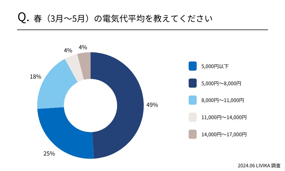 春(3月〜5月)の平均電気代は49%が「5,000円〜8,000円」との結果でした。