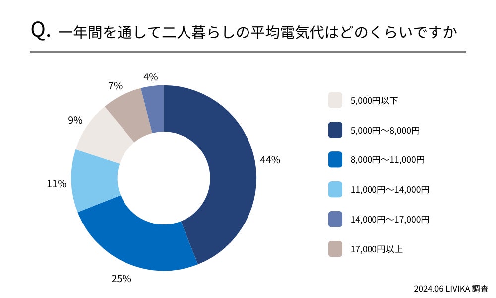 九州地方にお住まいの二人暮らし家庭の一年間の平均電気代は44%が「5,000円~8,000円」と回答しました。次いで「8,000円~11,000円」と回答した方も25%と多く、約7割のご家庭で一年間の平均電気代が11,000円以下である事が分かりました。