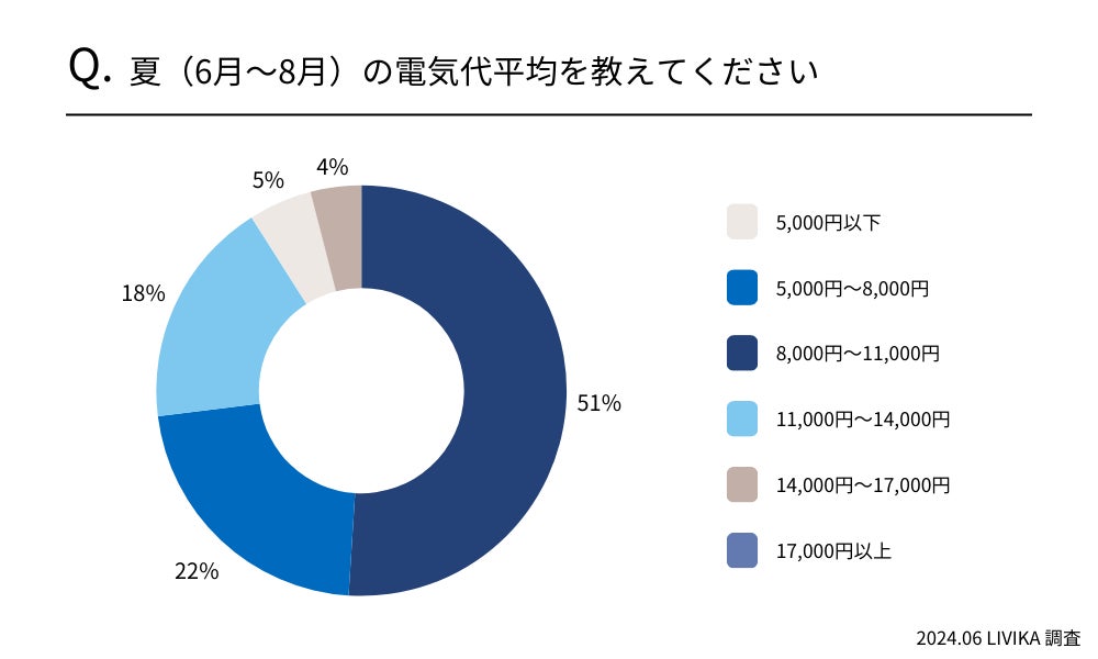 夏(6月~8月)の平均電気代は「8,000円〜11,000円」の回答が51%でした。