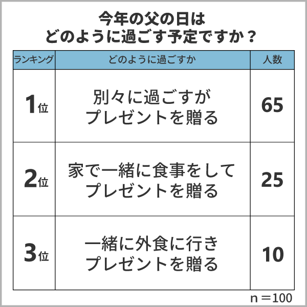 男女100人に「今年の父の日はどのように過ごす予定ですか?」と質問したところ、6割以上の方が「別々に過ごすがプレゼントを贈る」と回答されました。