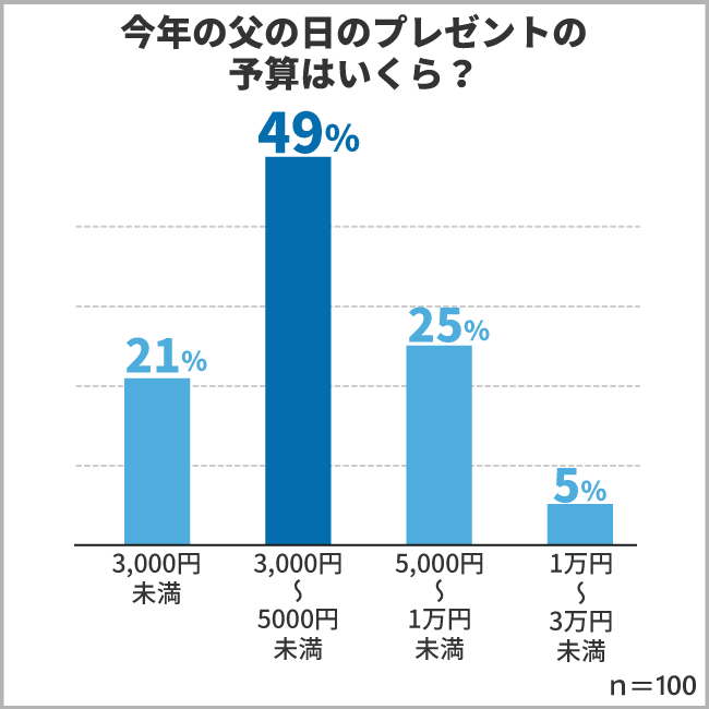 父の日のプレゼントの予算を聞いたところ、3,000円~5,000円未満の方が49%と約半分を占める割合となりました。次に5,000円~1万円未満の方が25%、3,000円未満の方が21%と続いています。