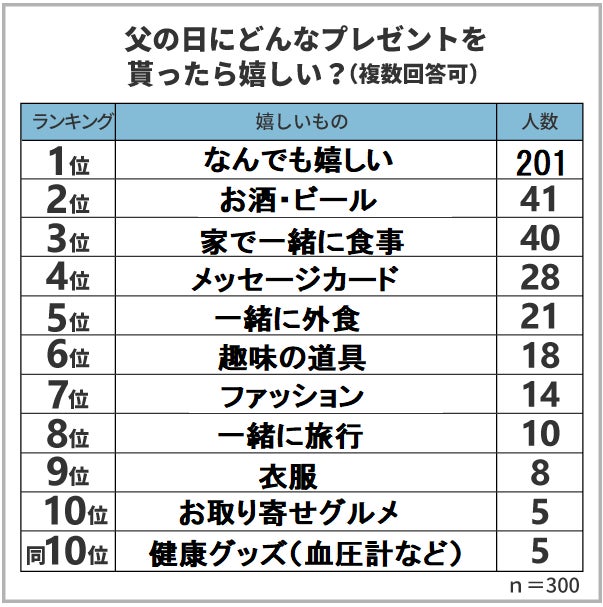 プレゼントを貰う側の立場にたったお父さん300人に「父の日にどのようなプレゼントを貰ったら嬉しいですか?」と複数回答で聞いたところ、300人中なんと201人のお父さんが「何でも嬉しい」と回答されました。