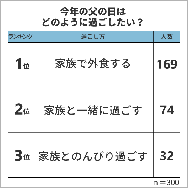最後に「今年の父の日はどのように過ごしたいですか?」と子供をもつお父さん300人に聞いたところ、「家族で外食する」「家族と一緒に過ごす」「家族とのんびり過ごす」が上位となりました。