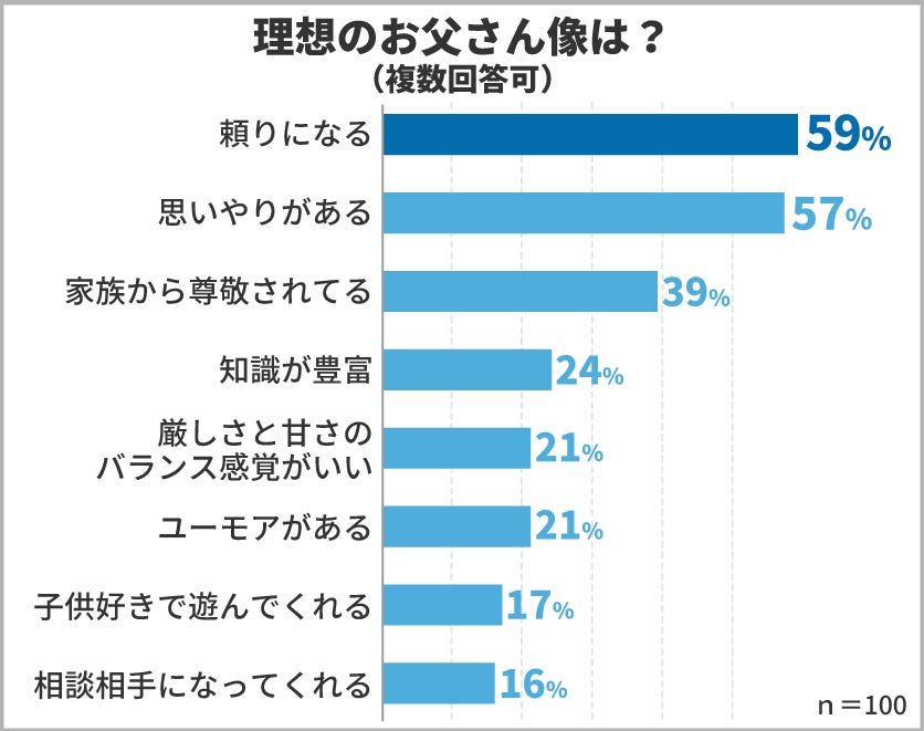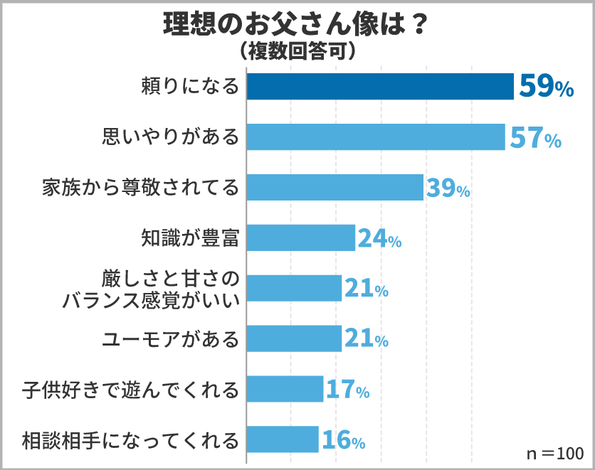 男女100人の方に「理想のお父さん像」を聞いてみたところ、「頼りになる」「思いやりがある」「家族から尊敬されている」が上位となりました。