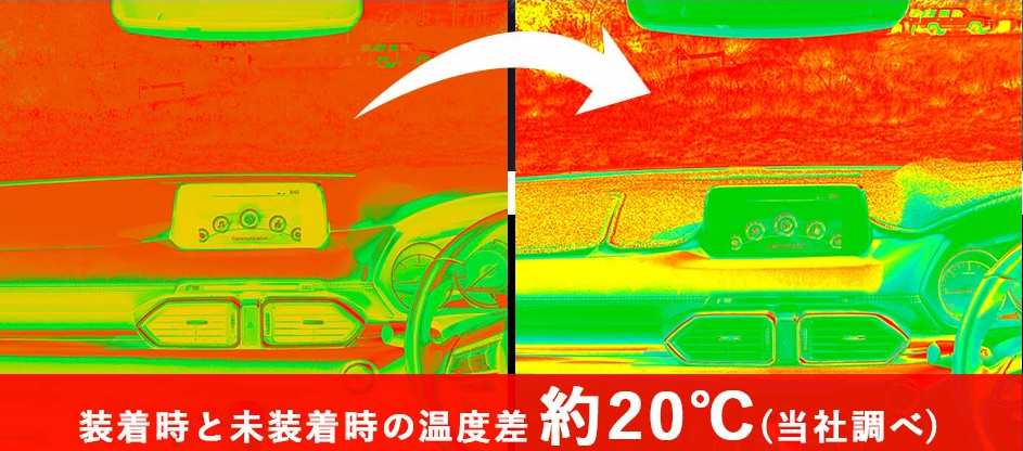 耐熱性のあるダッシュボードマットは、車内の急激な温度上昇の原因であるダッシュボードの熱吸収を防ぎます。過去に行った実験では、炎天下の車内で未装着時と装着時では最大20度の温度差が発生しました。車内の温度上昇を抑えるため、冷房の効き目が上がり、燃費を抑えることが出来る上に、激しく照り付ける直射日光からダッシュボードを守り、紫外線による劣化を防ぐこともできます。
