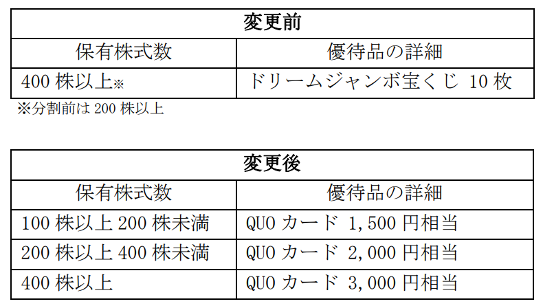 株主優待については、これまで200株以上(株式分割後は400株以上)を保有する株主様にドリームジャンボ宝くじ10枚(3,000円相当)を進呈しておりましたが、従来の基準通りであれば、400株以上保有の株主様にのみ株主優待の権利が付与されることになります。株式分割の影響により、100株以上400株未満を保有する株主様の増加が予想され、すべての株主様に対して株主優待制度を受けられるよう勘案した結果、2023年12月権利確定分より、保有株式数に応じたQUOカードの進呈に変更することといたしました。