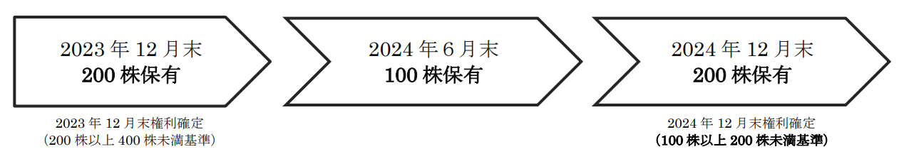 2023年12月末時点、2024年12月末時点での保有株式数は200株ですが、対象保有期間の2024年6月末では200株以上保有の基準を満たさないため、保有株式数の基準は100株以上200株未満が適用となり、2023年12月末権利確定分として2024年にQUOカード2,000円相当の進呈、2024年12月末権利確定分として2025年にQUOカード1,500円相当の進呈となります。