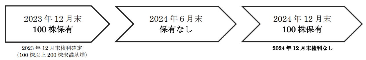 2023年12月末時点、2024年12月末時点での保有株式数は100株ですが、対象保有期間の2024年6月末では100株以上保有の基準を満たさないため、2023年12月末権利確定分として2024年にQUOカード1,500円相当の進呈、2024年12月末権利はなく、2025年での進呈は対象外となります。