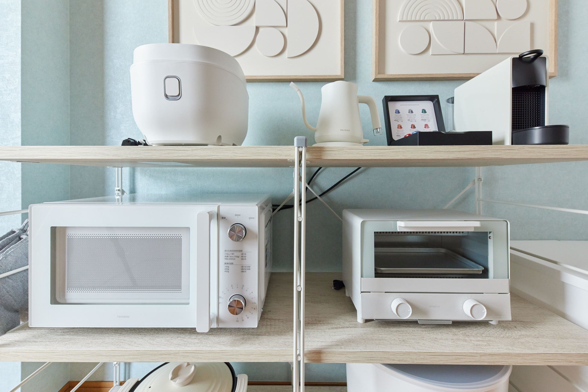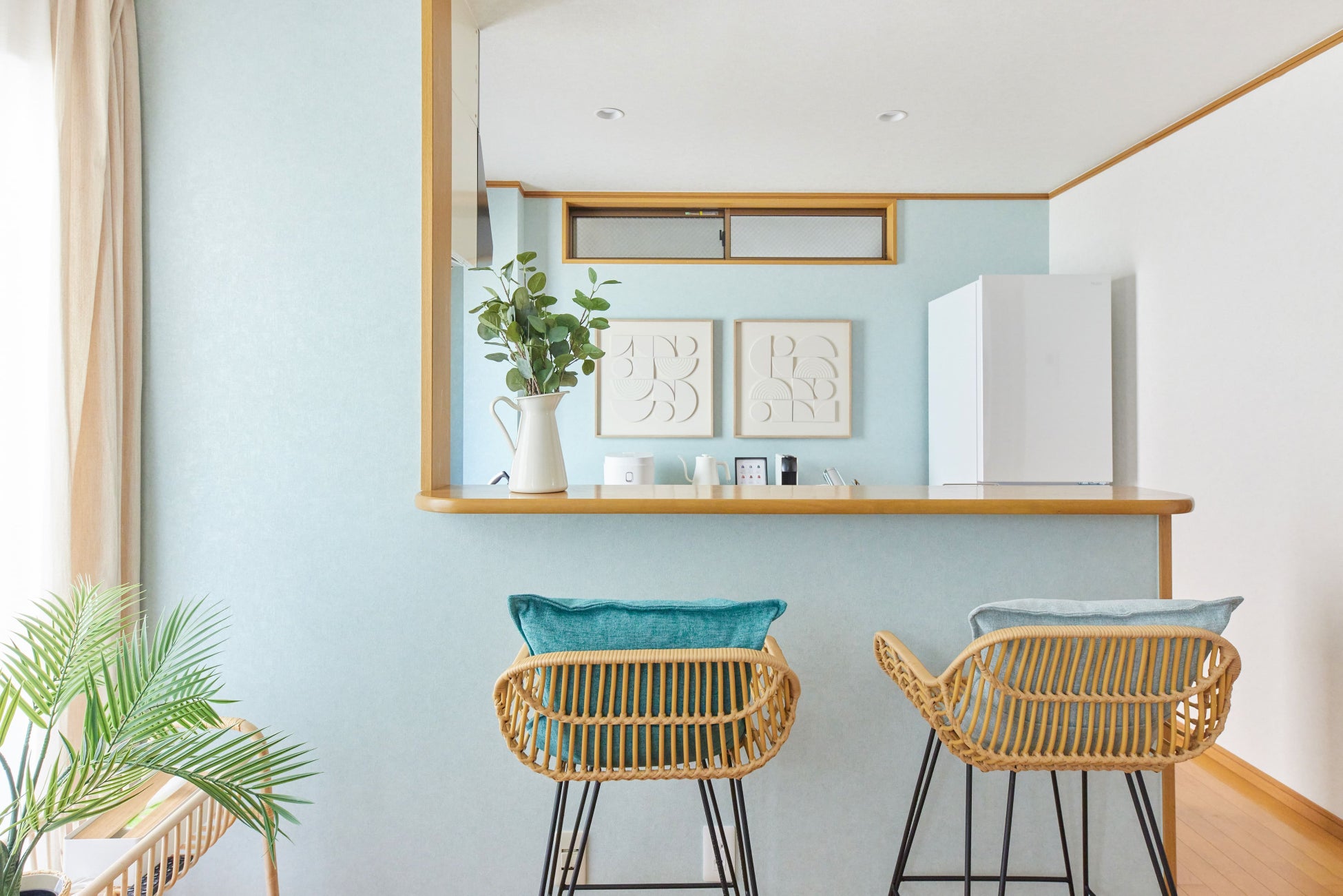 キッチンカウンターには天然素材のラタンチェアを配し、柔らかなブルーのアクセントウォールがさわやかな印象を与えます。キッチン背面には調理器具や家電も充実。様々なライフスタイルに適応できるよう設備を整えています。