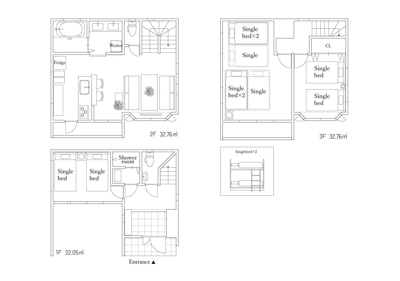 (1階居室:シングルベッド2台 3階居室1:シングルベッド2台 3階居室2:シングルベッド6台)