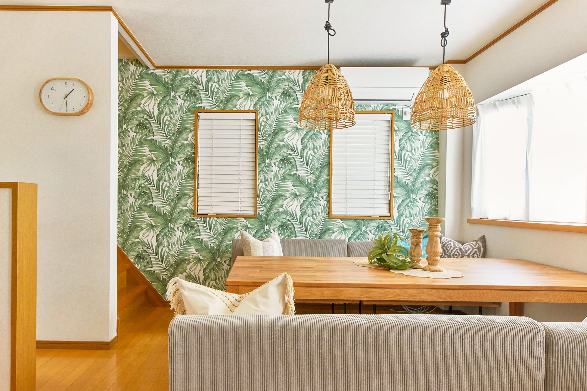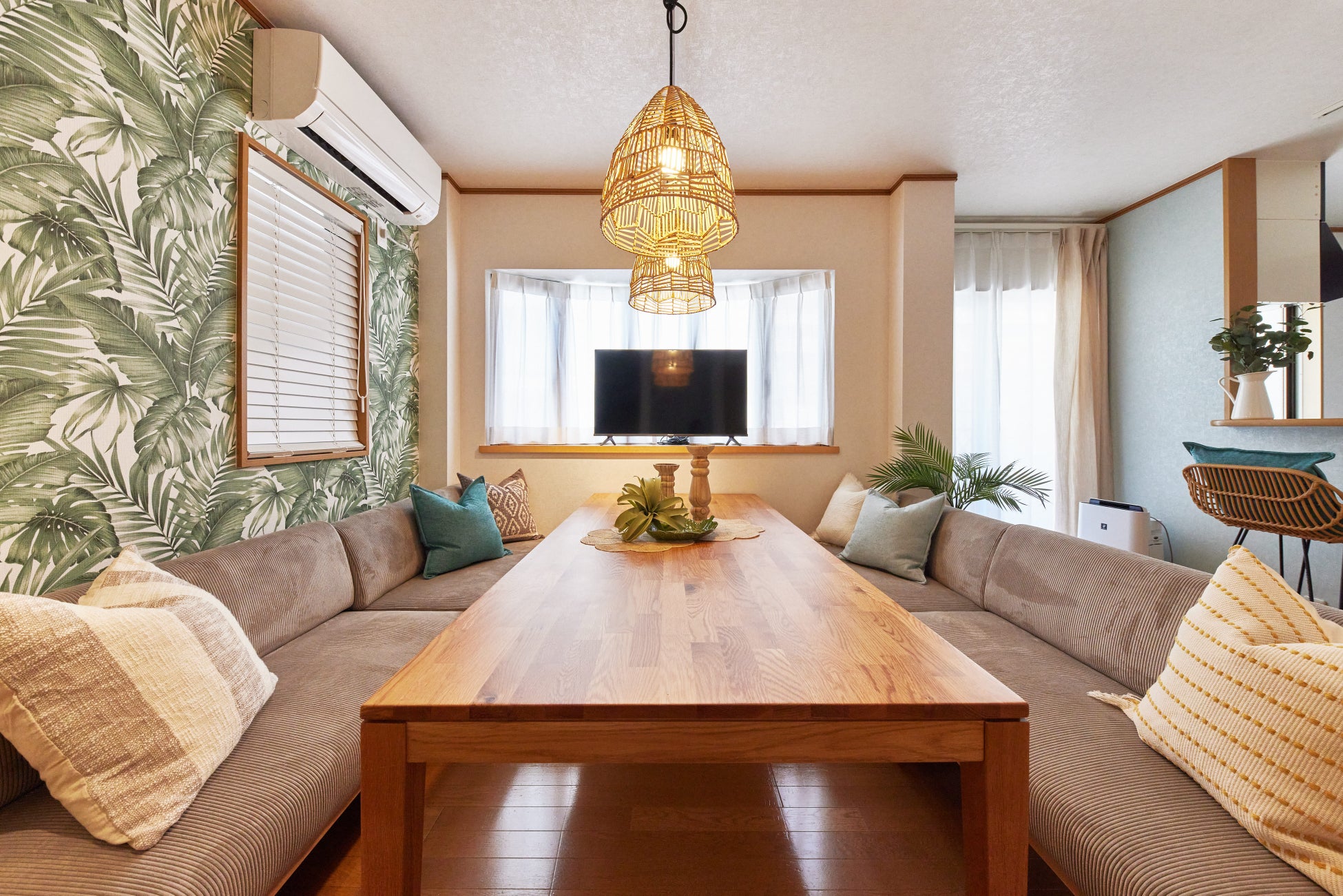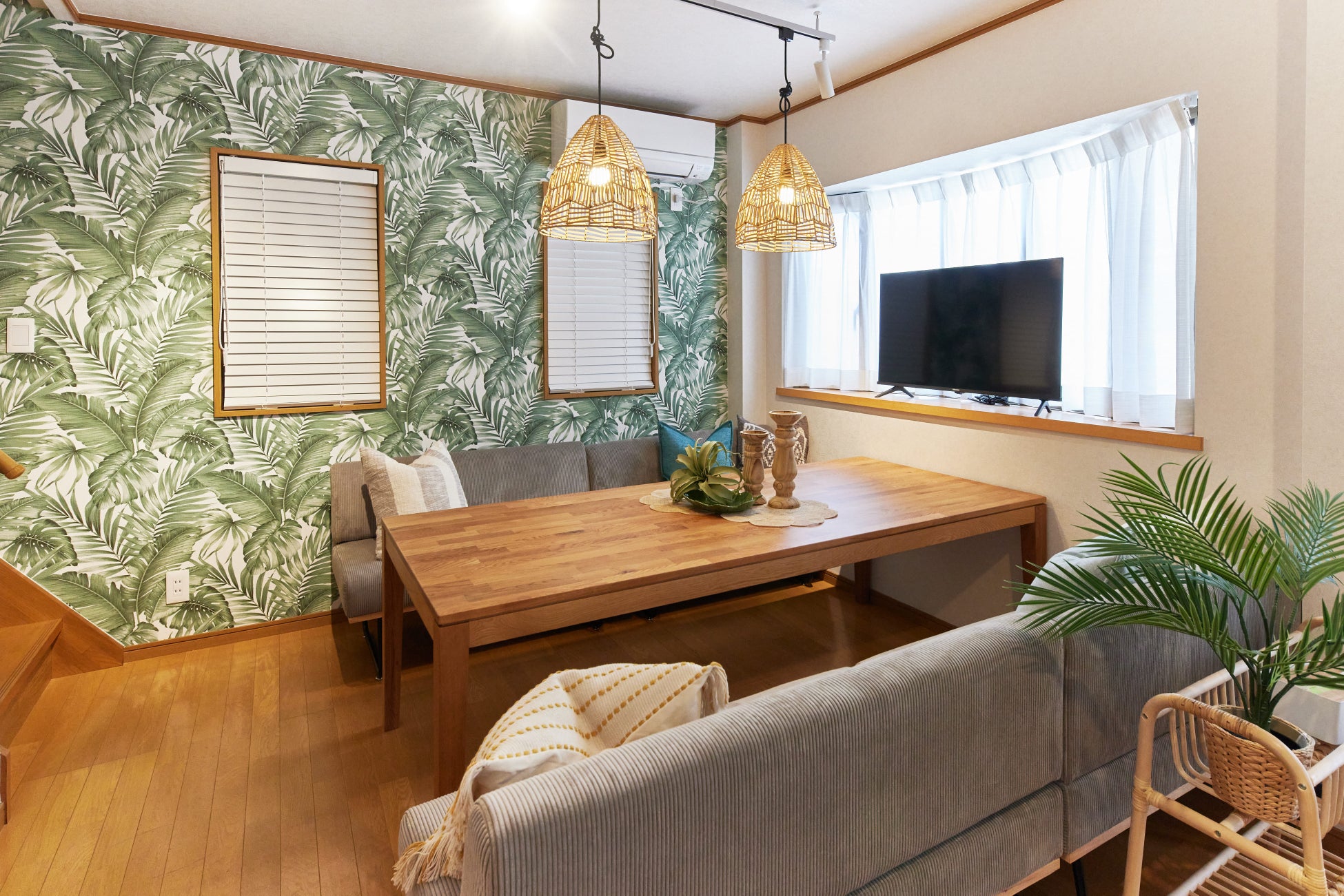 当施設の大きな特徴はリゾート感あふれるインテリア。ラタン素材や自然を感じさせるインテリアや内装の配色を意識し、リゾートを彷彿とさせるような南国テイストの空間に仕上げました。壁にはグリーンのリーフ柄のクロスを取り入れ、都会の喧騒を忘れさせてくれるような非日常のリビング空間を演出しています。