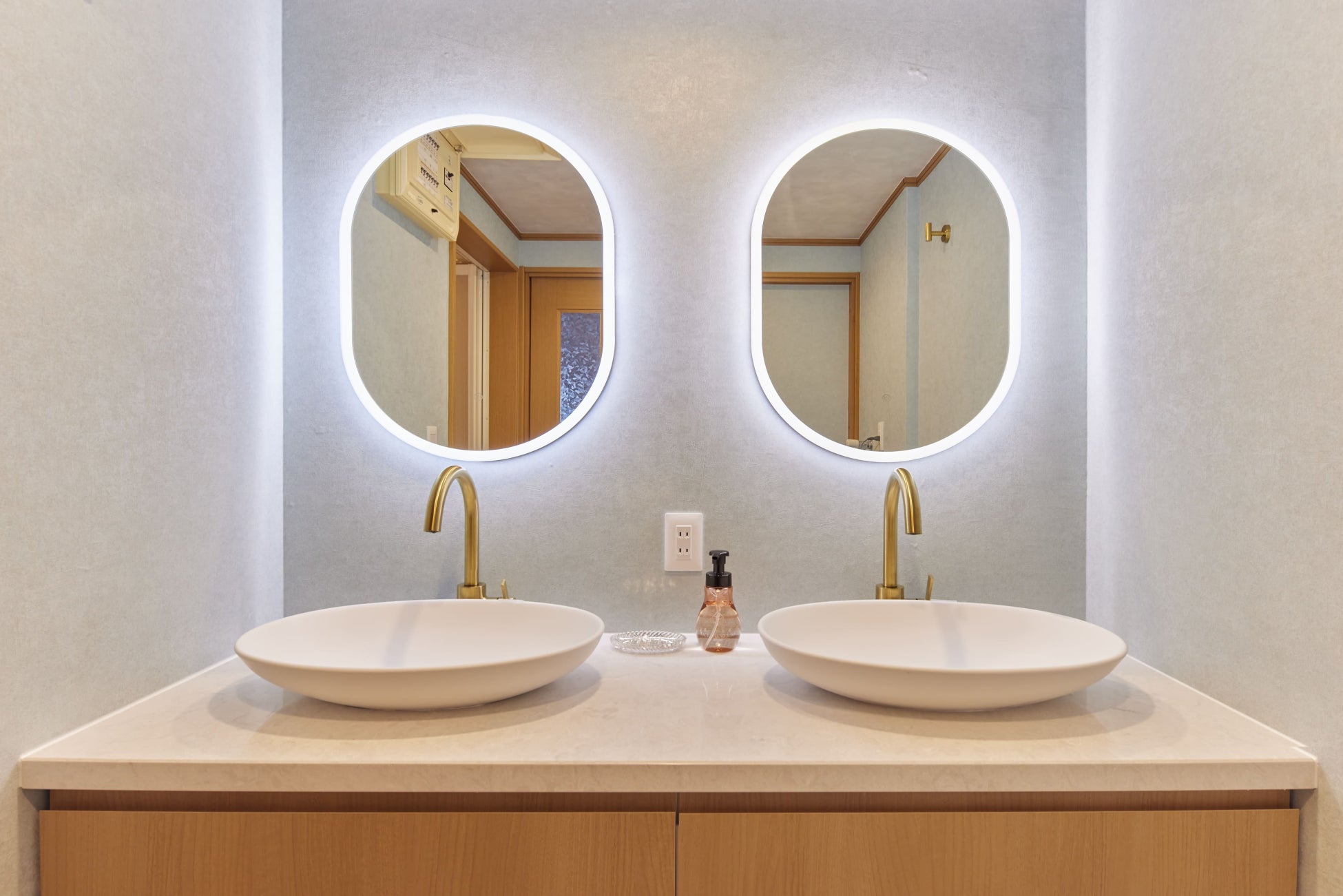 大人数での滞在でも快適に過ごせるよう、水回り設備も充実しています。バスタブ付きの浴室に加え、シャワールームを別途1室設置し、朝の準備時間もストレスフリーに。洗面化粧台には2つのボウルを備え、同時に複数人が身支度できる仕様となっております。海外からのゲストにも配慮し、シンプルかつ清潔感のあるデザインとしながらも、木の温もりを感じられる空間演出にもこだわりました。洗濯機も完備しており、長期滞在やファミリー旅行にも対応。ホテル以上に“自分たちの空間”として、自由度の高い滞在を可能にする水回り設計が、旅の快適さを一層引き立てます。
