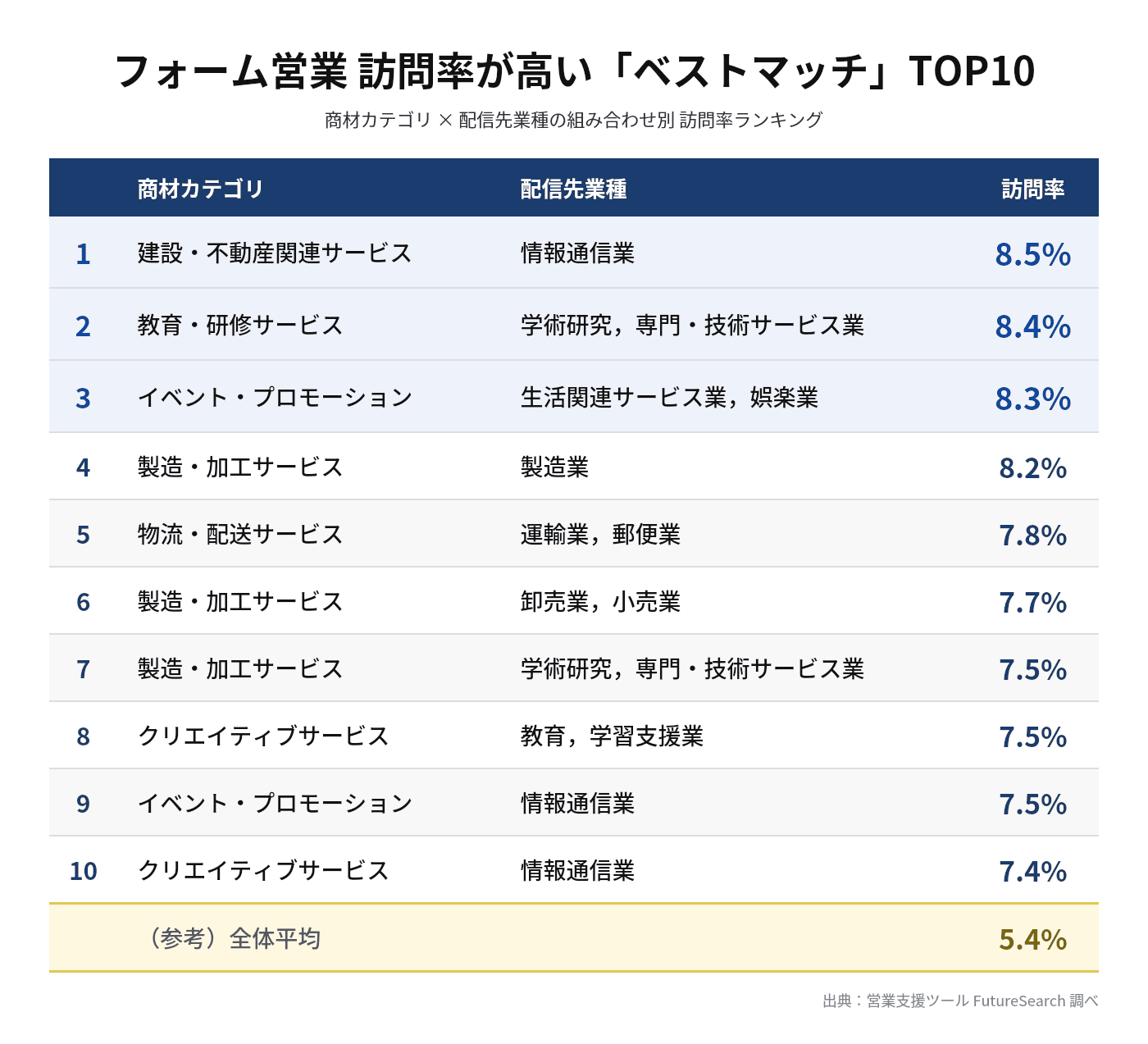 今回の調査は、フォーム営業の成否が「配信数」ではなく「配信の精度」──すなわち商材と業種の組み合わせの最適化──で決まることを、大規模データによって実証しました。