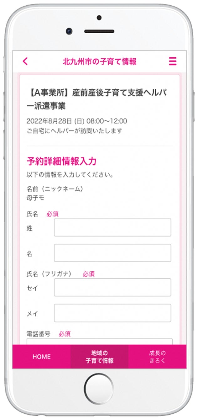 『きたきゅう子育て応援アプリ』各ページの下部にある「地域の子育て情報」メニューを押し、表示された画面の「産前産後子育て支援ヘルパー派遣事業」のバナーを選択します。予約ページが表示されたら、利用を希望する日時を選択し、氏名や連絡先、希望する援助内容などを入力して予約します。予約後に、ヘルパー事業所の担当者から電話が入り、電話で予約内容の確認後、予約が完了します。