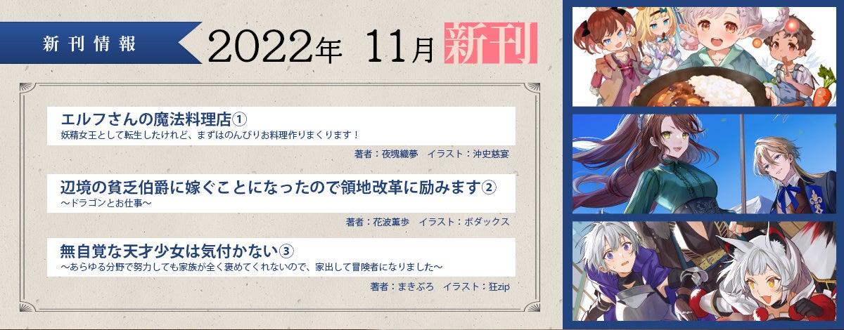 人気シリーズ『辺境の貧乏伯爵』&『無自覚天才少女』、更に新作『エルフさんの魔法料理店』が登場!