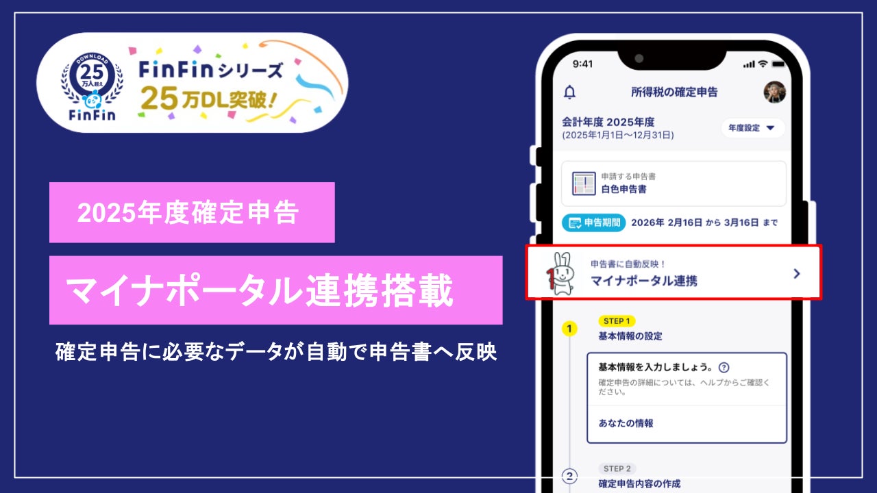 確定申告データの自動反映により負担軽減。スマホで会計処理ができるアプリ「FinFin」シリーズが累計25万DL突破、新たにマイナポータル連携を開始