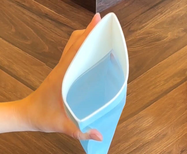(1)携帯トイレのチャックを開け、しっかりと広げます。