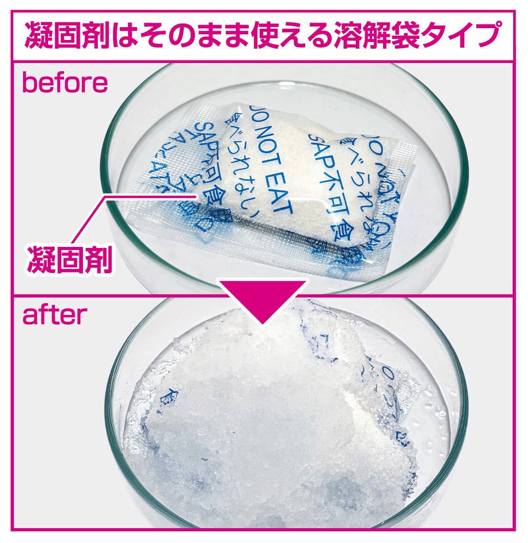 凝固剤のビニールは、水にとけるため、粉が飛び散る心配がありません。