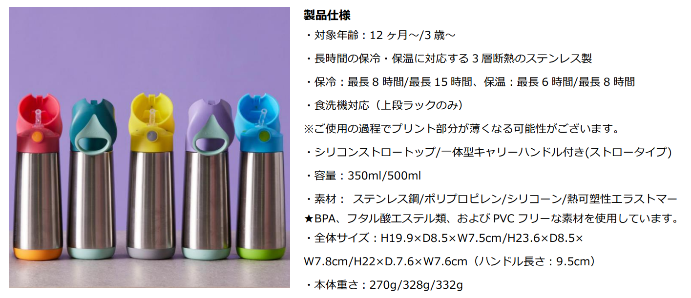冷たいものも温かいものも長時間保冷できる、3層断熱性のステンレスボトルです。キャリーハンドル付きの蓋はワンプッシュで簡単オープン。飲み口はストロー飲みと直飲みスパウトの2タイプ。ステンレス部分は小さな手でも支えやすい様に少し円錐形に設計されています。シンプルでおしゃれな見た目で可愛いだけでなく、全パーツ食洗機対応で洗いやすいので保育園・幼稚園の通園や、小学校の通学にもおすすめです。