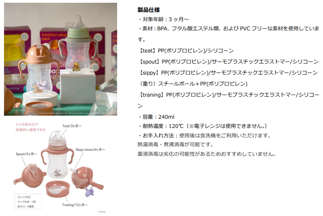 卒乳のタイミングの時期から使えるハンドル付きのティートとスパウト、そして離乳食が始まると必要になるストローマグ、最後にコップ飲みまでのドリンクトレーニングができるセットアイテムです。1カップに4種類の飲み口がついています。赤ちゃんの成長に合わせて蓋を交換するだけで、3ヶ月から12ヶ月以上の赤ちゃんのドリンクトレーニングに対応できます。