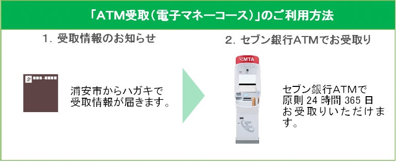 株式会社セブン銀行グループの株式会社セブン・ペイメントサービス(本社:東京都千代田区、代表取締役社長:柏熊 俊克)は、千葉県浦安市(市長:内田 悦嗣、以下 浦安市)へ「ATM受取(電子マネーコース)」の提供を開始しました。