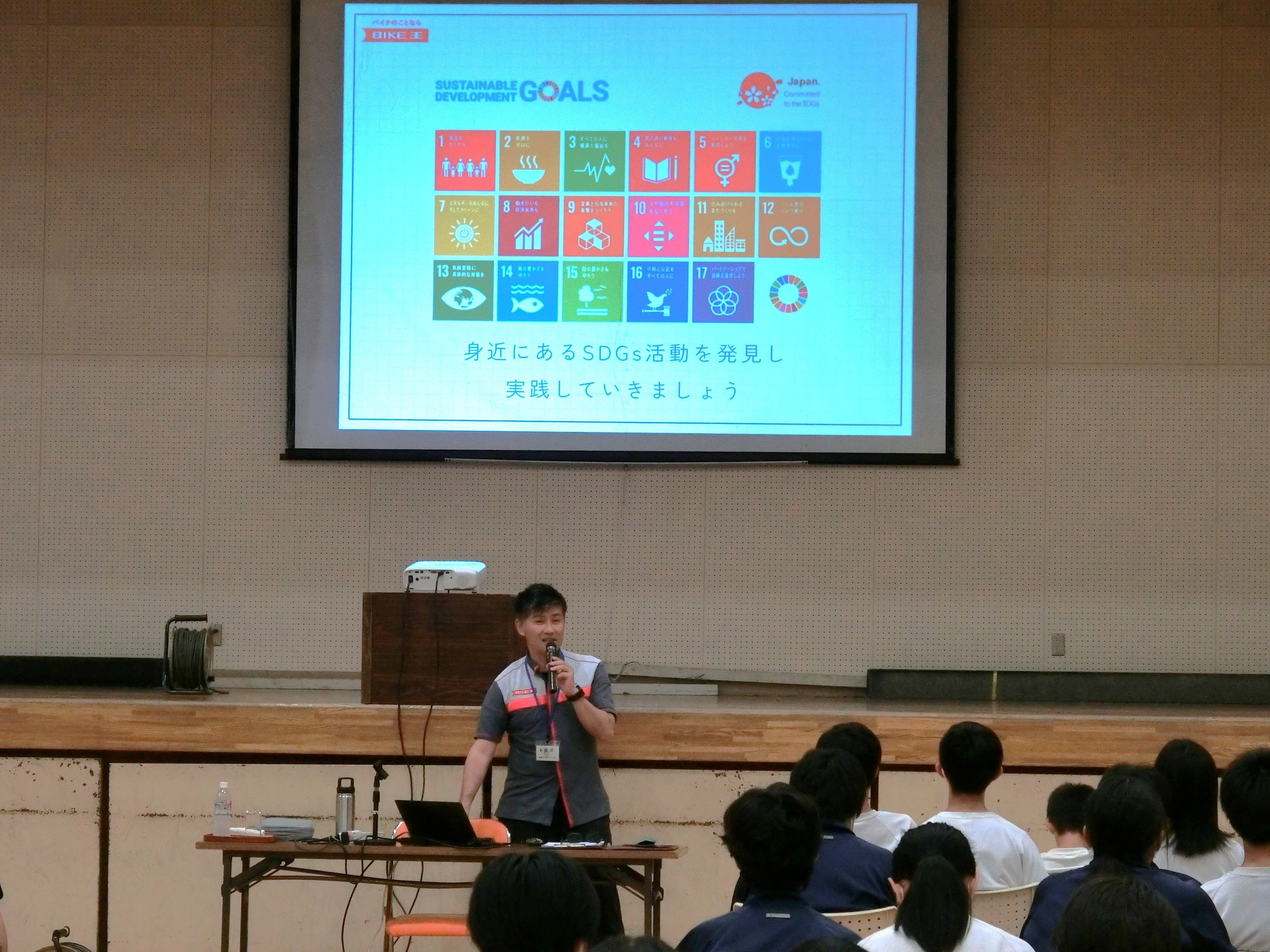 当日は、当社事業推進本部の髙浜 優一が講師として登壇し、生徒201名を前に、出前授業を行いました。
