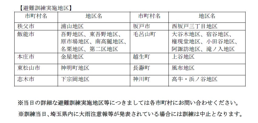 県内でも、42市町村、約1,500人が参加し、情報伝達訓練を行うとともに、秩父市ほか9市町では併せて避難訓練も実施いたします。