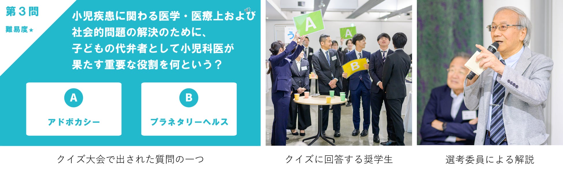 クイズ大会では、小児医学への関心をさらに高めてもらうために関連するテーマを取り上げ、チーム対抗で様々なクイズに挑戦してもらいました。小児科医として活躍する選考委員からの解説もあり、奨学生が真剣に耳を傾ける姿が印象的でした。