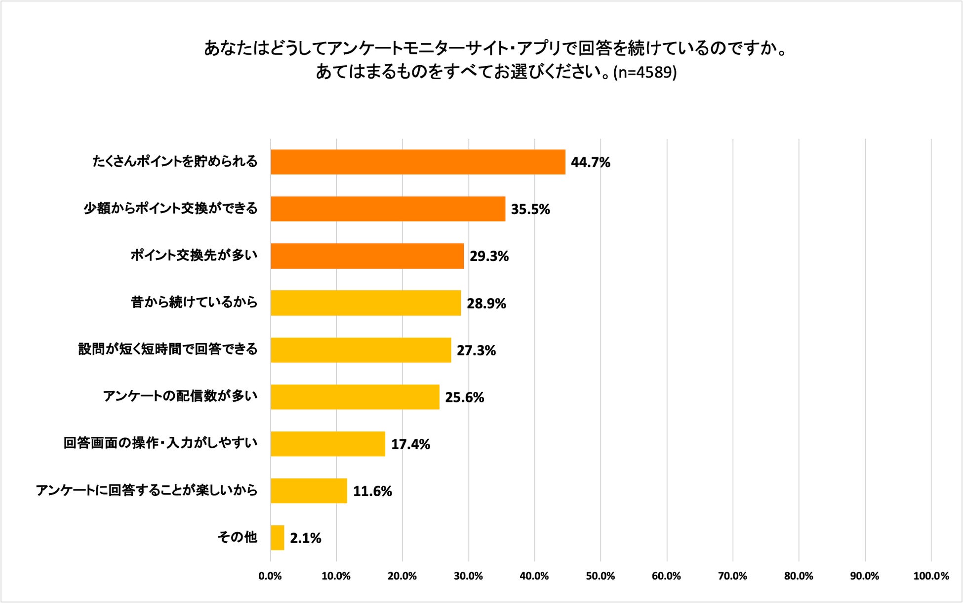 アンケートモニターサイト・アプリで回答を続ける理由について確認をしたところ、「たくさんポイントが貯められる」44.7%、次いで「少額からポイント交換ができる」35.5%、「ポイント交換先が多い」29.3%と続きました。当然のことではありますが「ポイ活」を目的としてアンケート回答している以上は、お得にポイントを得られるか、得られたポイントを効率よく使うことができるかを重視していることがわかります。アンケートそのものではなく、アンケート回答するWebサイトやアプリサービスに備えている機能(ポイントの少額交換やポイント交換先)が、満足度に大きく影響すると考えられます。