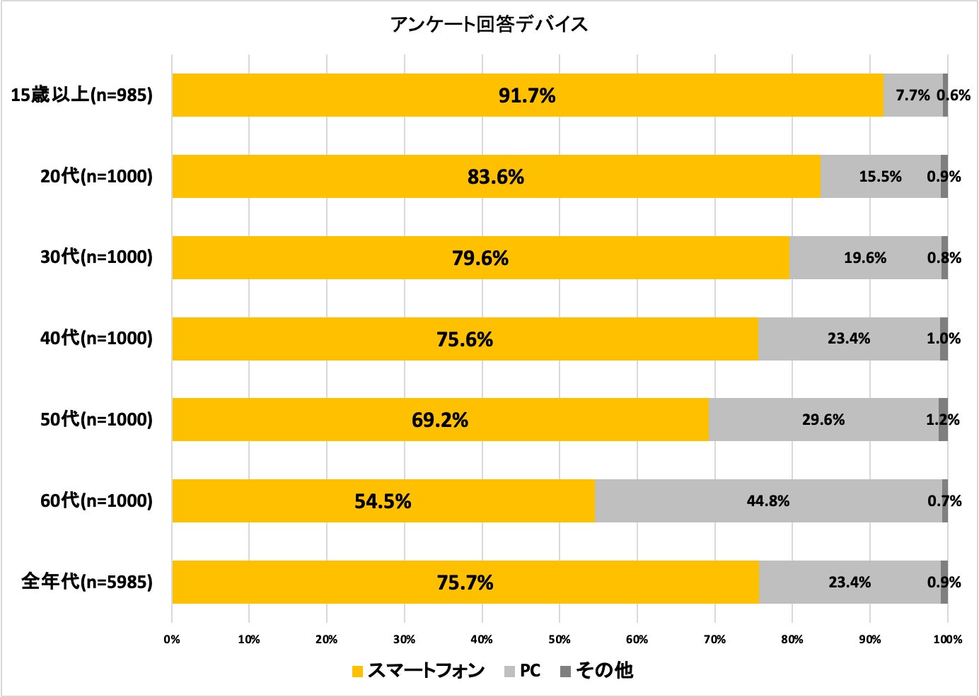 まず回答者5,989人の回答デバイスを確認したところ、約76%がスマートフォンからの回答でした。また、年代別での回答デバイスでは若年ほどスマートフォンでの回答比率が高く、10代では約92%、20代でも約84%となっています。また60代においても半数以上がスマートフォンからの回答となっています。今さらではありますが、アンケート調査の回答インターフェースはスマートフォンブラウザからの回答であることを前提としての設計を避けて通ることはできないものとなっています。