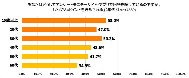 また特筆すべき点として、年代が若いほど「たくさんポイントが貯められる」を重視する傾向が高いことがわかりました。若年層のアンケートモニターの減少傾向への対策の1つとして謝礼額の見直しは有効となる可能性があります。