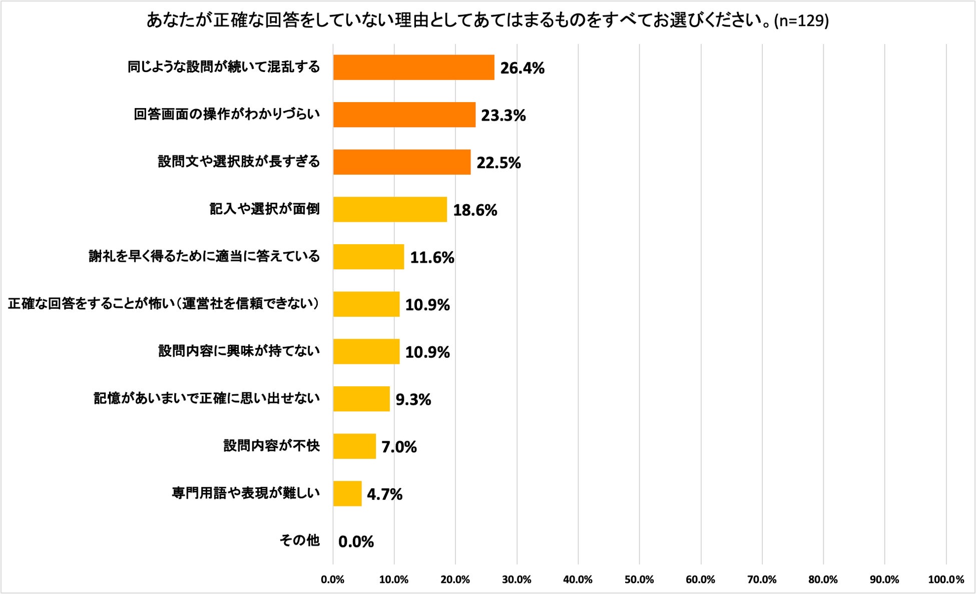 「なぜ、正確な回答をしていないのか」を聴取したところ、「同じような設問が続いて混乱する」26.4%、「回答画面の操作がわかりづらい」23.3%、「設問文や選択肢が長すぎる」22.5%と続きました。いずれも回答のしづらさを理由とするものとなっています。アンケートモニターは意図的に不正確な回答をしているのではなく、アンケート回答体験の中ですべて正確に回答することを諦めてしまっているのではないでしょうか。不正確な回答を減らすためにはアンケート回答体験を向上させるためのアンケート設問設計、回答画面が重要と考えられます。