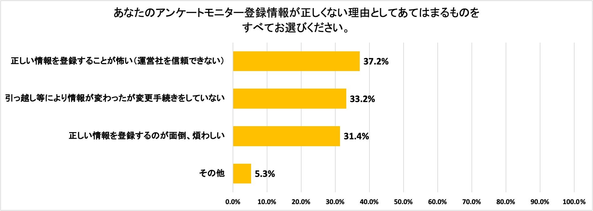 アンケートモニターとして登録している情報(年齢や居住地、職種など)が「一部は正しくない情報で登録している」「ほとんど・まったく正しくない情報で登録している」としたユーザーにその理由を聴取しました。最も多い回答は「正しい情報を登録することが怖い」37.2%。次いで「引っ越し等により情報が変わったが変更手続きをしていない」が33.2%、「正しい情報を登録するのが面倒、煩わしい」が31.4%と続き、3つそれぞれの割合に大きな差がありませんでした。また自由回答にも「正しい情報を登録することで個人を特定できてしまう」ことへの懸念が目立ちました。