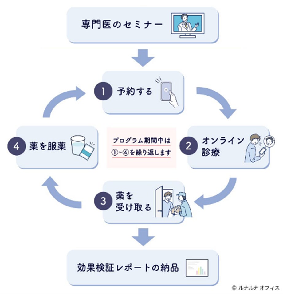 オンライン診療サービス『ルナルナ オンライン診療』を活用し、企業で働く従業員の健康課題改善から効果検証までを一気通貫でサポートする法人向けサービス。女性向けには、月経やPMSの症状から、妊娠や不妊、更年期症状に関するセミナーや産婦人科医への相談、男性向けには、男性更年期に関するセミナーや泌尿器科医への相談の機会を提供しています。