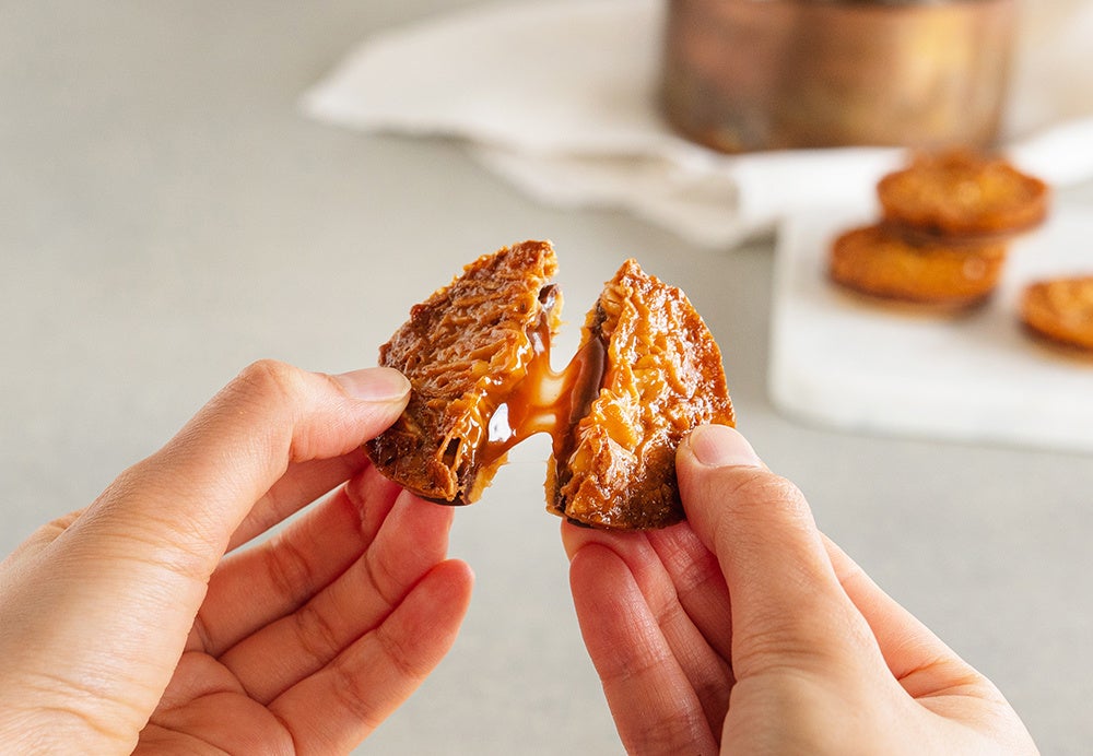 香ばしく華やかな甘さのアーモンドフロランタンとバターサブレで、とろけるキャラメルをサンドした「キャラマーサンド」。薄く焼き上げたバターサブレにはチョコレートをまとわせています。芳醇なバターと香ばしいアーモンド、そしてとろけるキャラメルとチョコレート、素材そのものの風味を感じていただける当店を代表するフレーバーです。