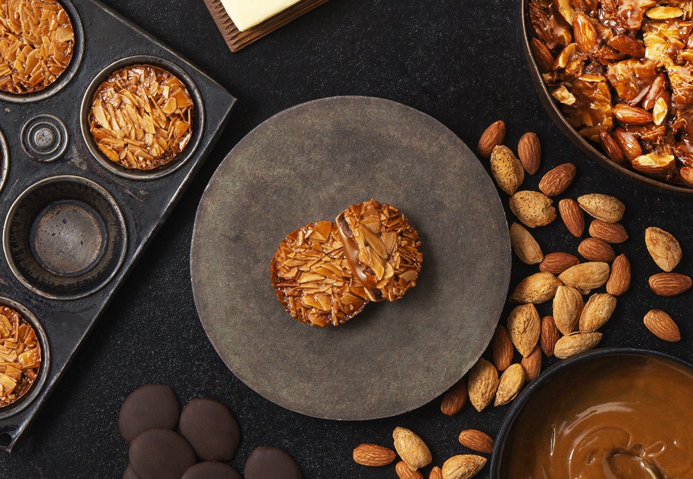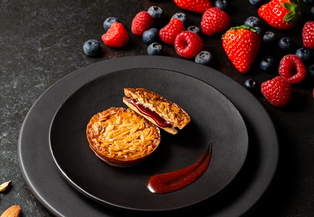 苺、ラズベリー、ブルーベリーをバランスよく合わせて艶やかに炊き上げたベリーキャラメルをクーベルチュールチョコレートで包み、華やかな甘味のアーモンドフロランタンとバターサブレでサンドしました。