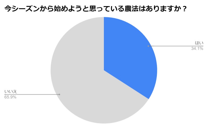 「今シーズンから始めようと思っている農法はありますか?」(n=85)と生産者様に質問したところ、「はい」と回答した方が29名(34.1%)、「いいえ」と回答した方が56名(65.9%)という結果となりました。