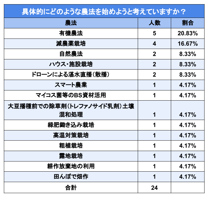 「具体的にどのような農法を始めようと考えていますか?」(n=24)と生産者様に質問したところ、「有機農法」が最も多く5名(20.83%)、次いで「減農薬栽培」が4名(16.67%)という結果となりました。