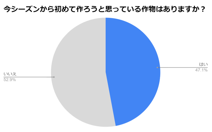 「今シーズンから初めて作ろうと思っている作物はありますか?」(n=85)と生産者様に質問したところ、「はい」と回答した方が40名(47.1%)、「いいえ」と回答した方が45名(52.9%)という結果となりました。