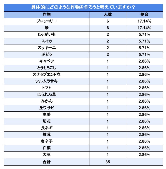 「具体的にどのような作物を作ろうと考えていますか?」(n=35)と生産者様に質問したところ、「ブロッコリー」と「米」が最も多く、それぞれ6名(17.14%)、次いで「じゃがいも」、「スイカ」、「ズッキーニ」、「ぶどう」と回答した方がそれぞれ2名(5.71%)という結果となりました。