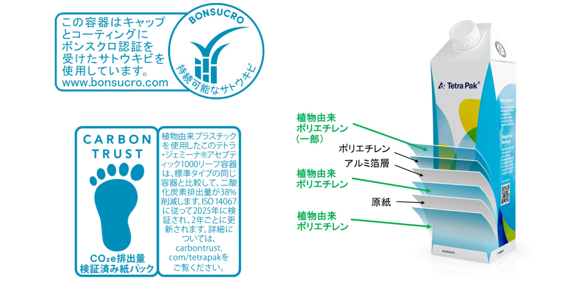 このCO₂削減率はCarbon Trust認証を取得しており、該当容器にはCarbon Trust認証ラベルが印刷され、視覚的にCO₂削減を訴求できるようになります(*2)。さらに、植物由来のポリエチレンはBonsucro認証(*3)を取得しており、サトウキビの持続可能な生産を支援しています。なお、日本テトラパックが国内で販売するアルミ付き紙容器(大型:500ml以上) において、植物由来ポリエチレンを採用するのは初めてです(*4)。