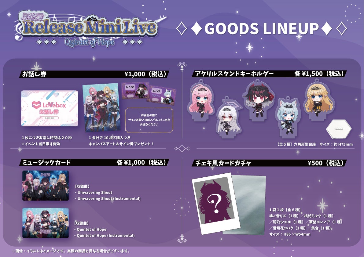 会場では、アクリルスタンドキーホルダーやミュージックカード、チェキ風カードガチャがラインナップされたオリジナルグッズの販売を実施。さらに、メンバー自身がデザインを手がけたコラボドリンクも登場。ライブとあわせてお楽しみいただけます。“ステージの上だけじゃない、クインテのすべてを味わえる一日”として、皆さまのご来場を心よりお待ちしております。