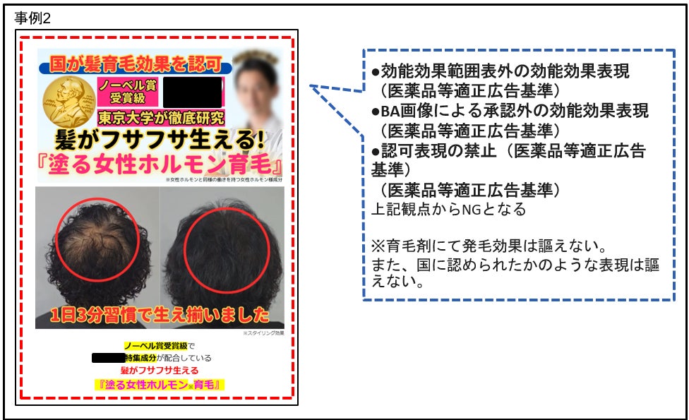 例6:育毛剤において、塗る植毛、誰にもバレずに生やせる、などの表現や、BA画像により、あたかも髪が生えるかのような表現。また白髪が生えてこなくなる、白髪ケア、などの白髪に効果があるかのような表現。