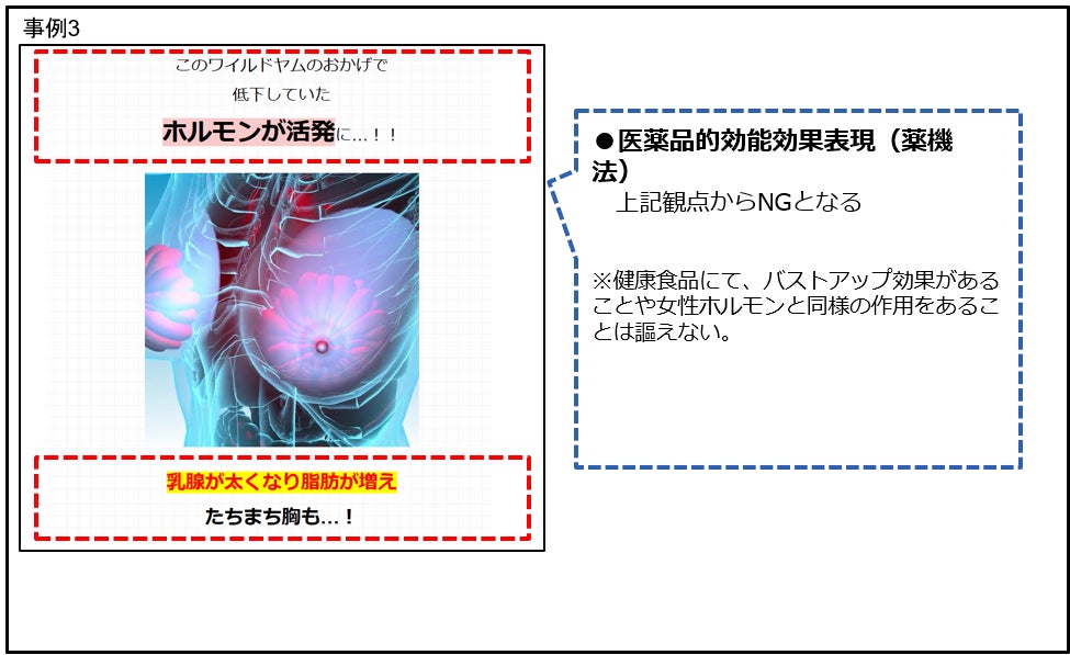 例3:(肌を指して)ぷるん、デトックス効果、身体の酸化を防ぐ、若返り、若見え、BA画像を用いてしみなど肌に対する効果があるように誤認させるような表現