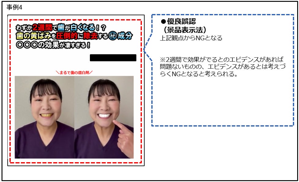 例8:歯みがき類において、ブラッシング効果である旨の記載なしに歯を白くするかのような表現(マウスウォッシュ商材)。また、物理的効果ではなく成分にて抗菌作用があるかのような表現。その他、歯が揺れるほどに弱っていた歯茎が固いものを噛めるほどに強くなったという、効果として誇大な表現。