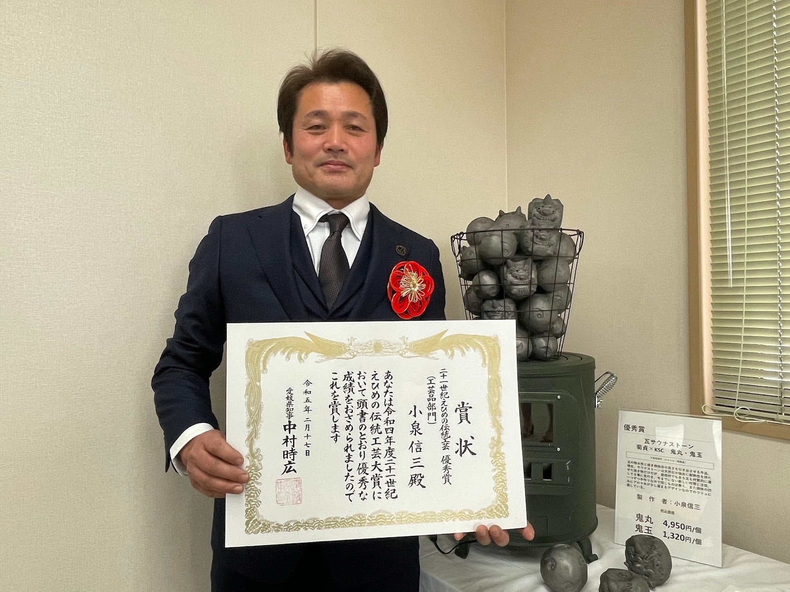 優秀賞には、工芸品部門で菊間瓦老舗窯元・小泉製瓦(今治市)の小泉信三社長(52)の「瓦サウナストーン 鬼丸・鬼玉」が受賞しました。 同大賞は県や伝統工芸団体でつくる実行委員会が毎年度開催。今回は42点の応募があり、百貨店のバイヤーや美術関係者らが一般投票も踏まえ審査し、入賞作品は12点が選ばれました。