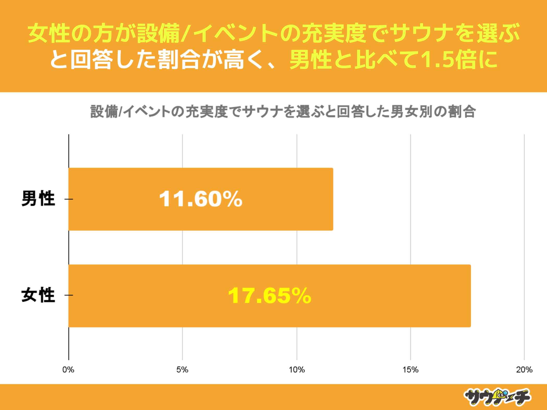 設備/イベントの充実度でサウナを選ぶと回答した割合を男女別でみてみますと、女性が17.65%、男性が11.6%